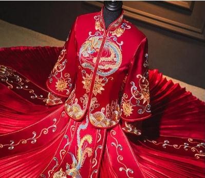 由于秀禾服整體給人一種端莊秀美之感,所以被越來越多的人喜愛,成為現(xiàn)代人結(jié)婚時所選擇的在婚禮禮服。秀禾服上的圖案多為孔雀、牡丹花、對蝶、喜字等寓意美好之物。